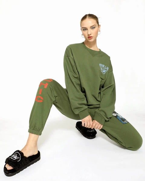 Mid-weight fleece fabric in olive green. High rise sweatpants with back and side pockets, elastic waistband and cuffs. Features rhinestone embellishments.