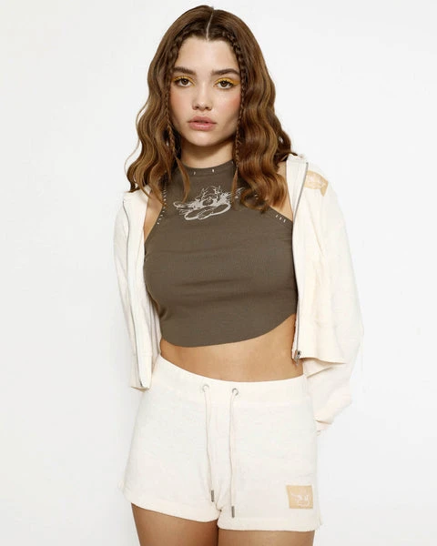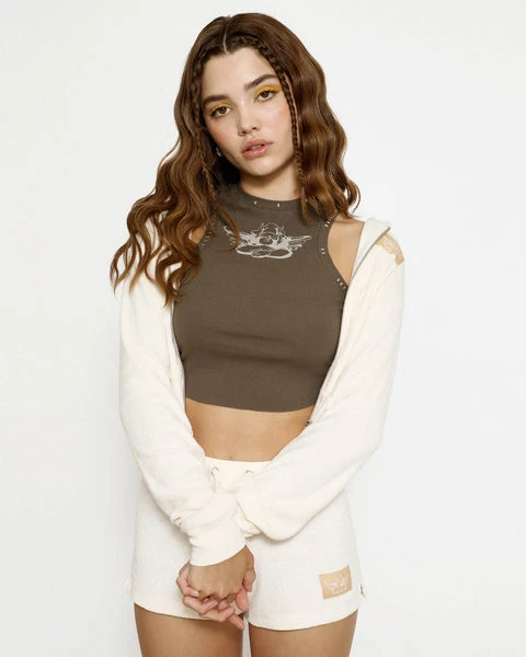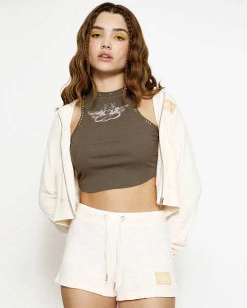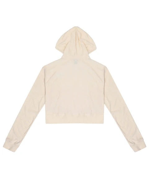 Lightweight terry cloth fabric in a very soft pink/cream color. Zip up hoodie with cropped hem, front pockets, and Boys Lie logo patch.