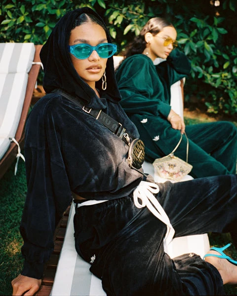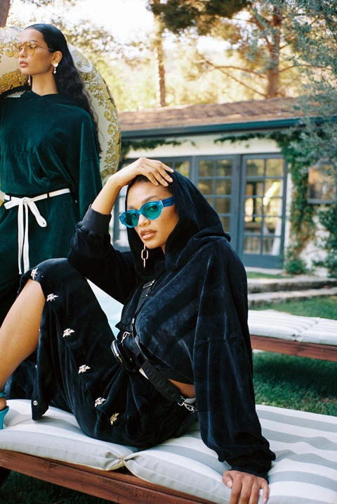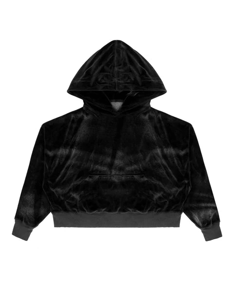 Velour cropped hoodie with front pocket, dolman sleeves, embroidered back logo, with ribbed cuffs and hem. Each item is hand dyed – may show slight color variations. Made in Los Angeles, California.