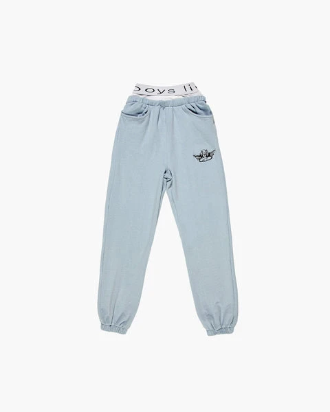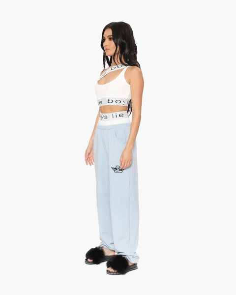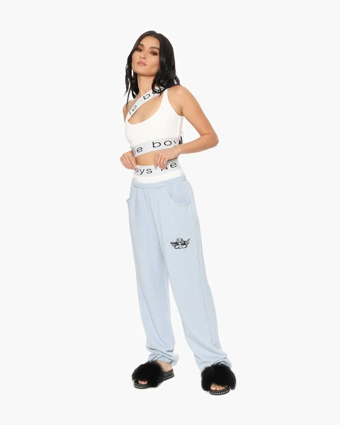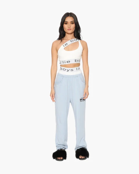 These sweats are made from a custom knit lightweight fabric that’s a cotton/tencel/spandex blend. The fiber contents allow for the softest hand of any french terry you have ever felt, and give a slight stretch for added comfort. There are boxers attached at the gathering with a custom Boys Lie jacquard nylon waistband. Embroidered angel logo and side pockets.