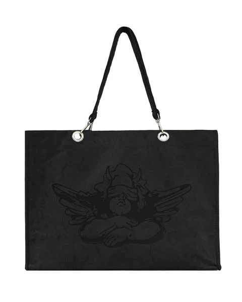 Oversized charcoal black velour structured tote. Small interior pocket, silver hardware, and magnetic closure.