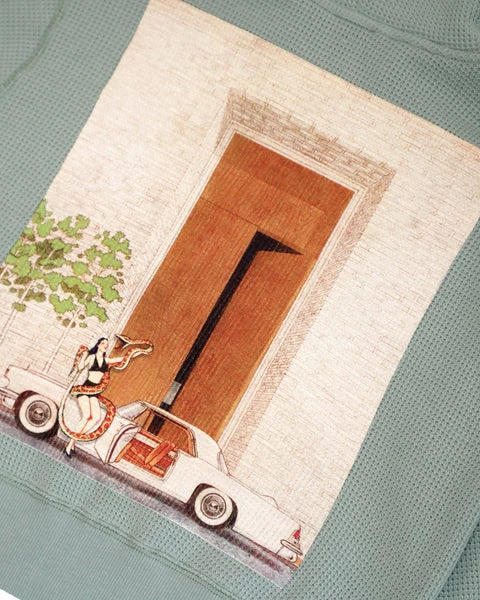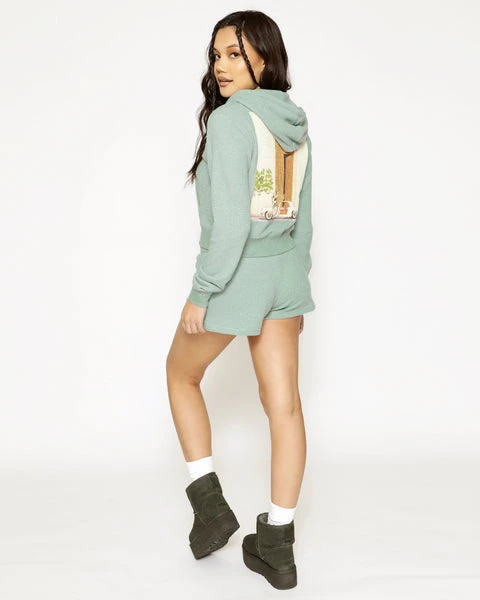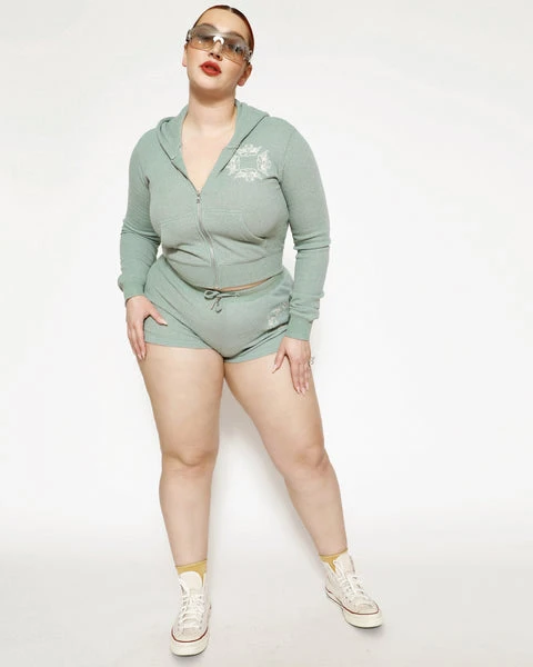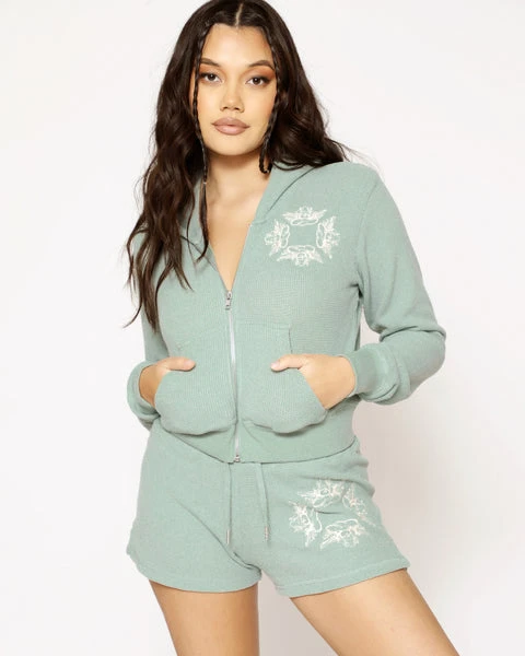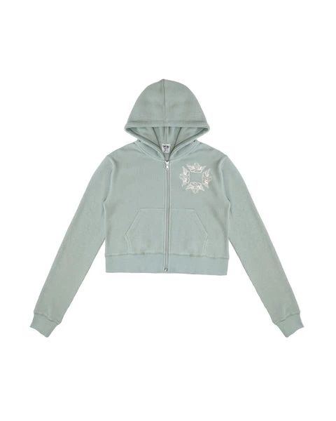 Soft thermal fabric in sage green. Zip up hoodie with cropped hem, front pockets, and embroidered front logos.