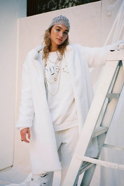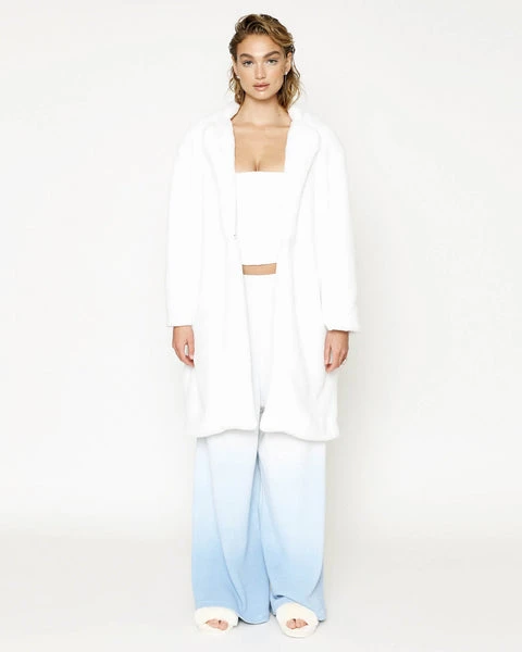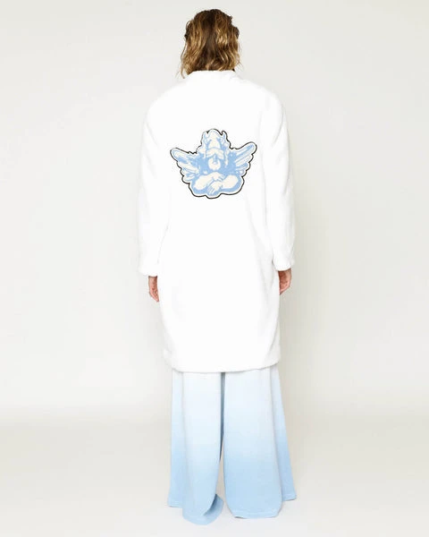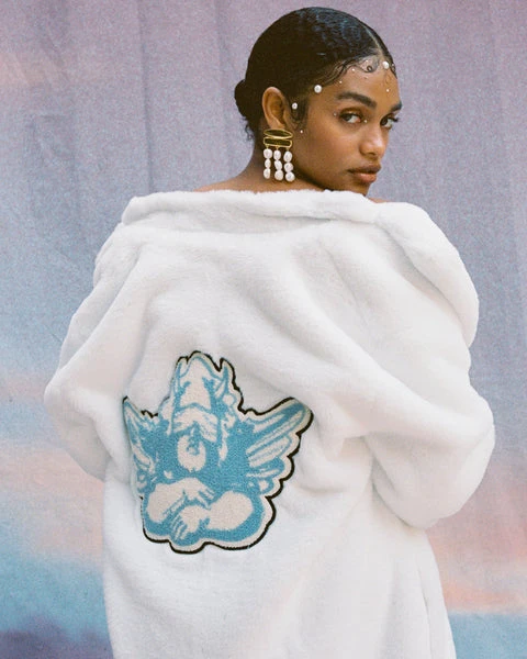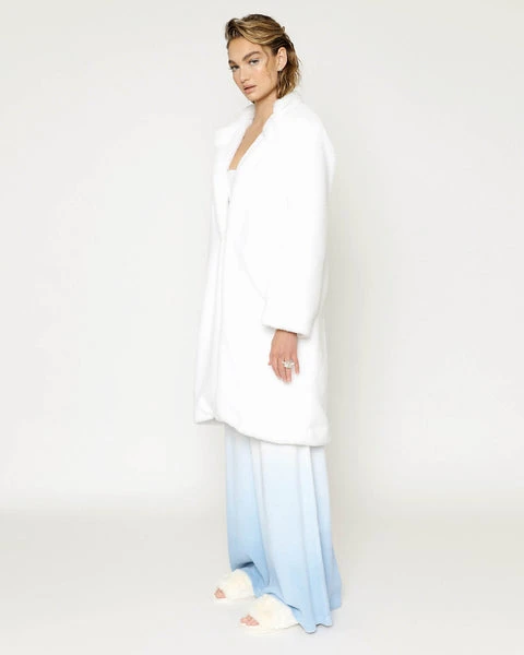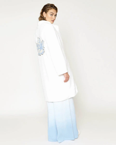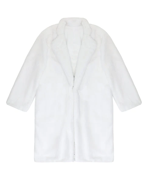 Luscious faux fur coat with collar, side pockets, and chenille logo patch.