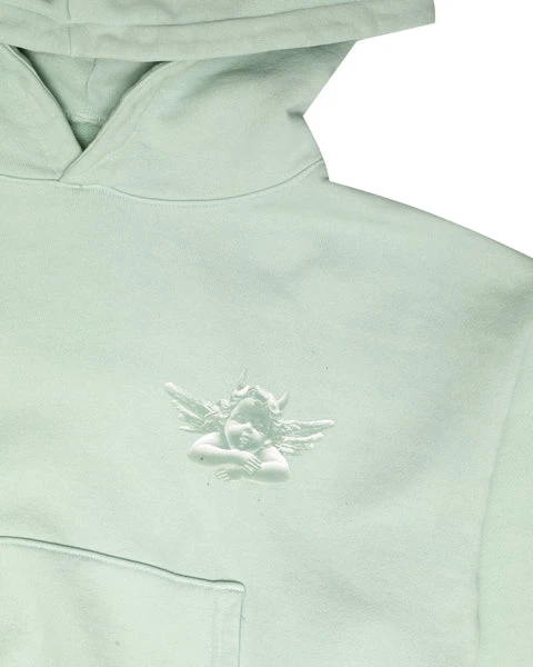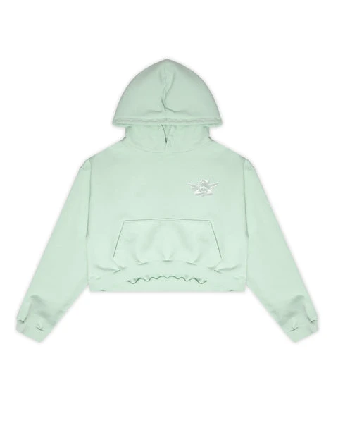 Heavyweight french terry. Oversized cropped hoodie featuring a dramatic hood, front pocket, and slightly curved front hem.