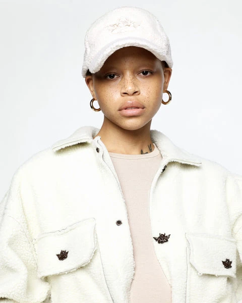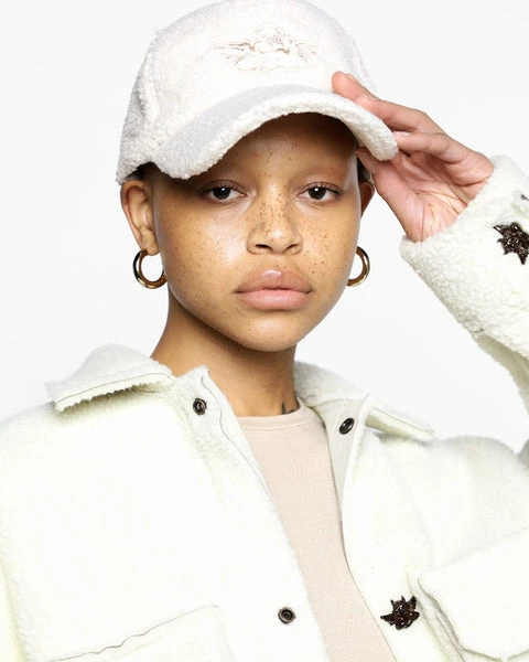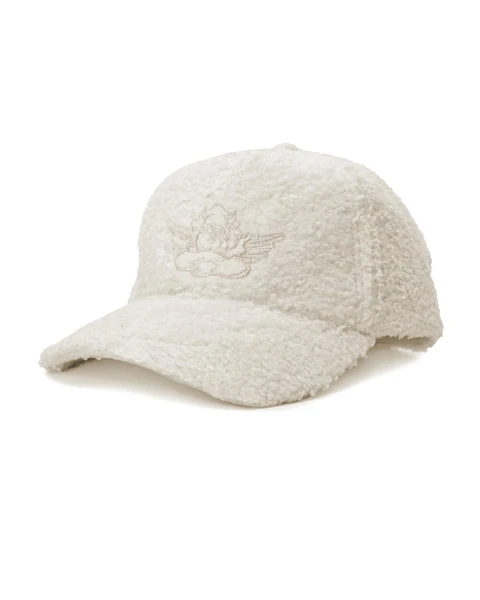 Faux sherpa baseball hat with Ariel x Boys Lie cherub logo and an adjustable velcro strap.