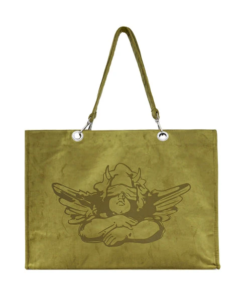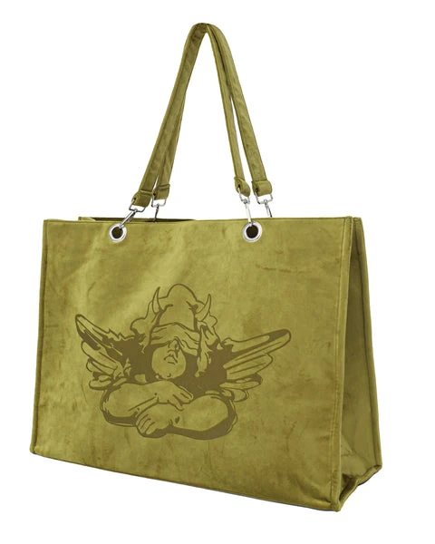Oversized olive green velour structured tote. Small interior pocket, silver hardware, and magnetic closure.