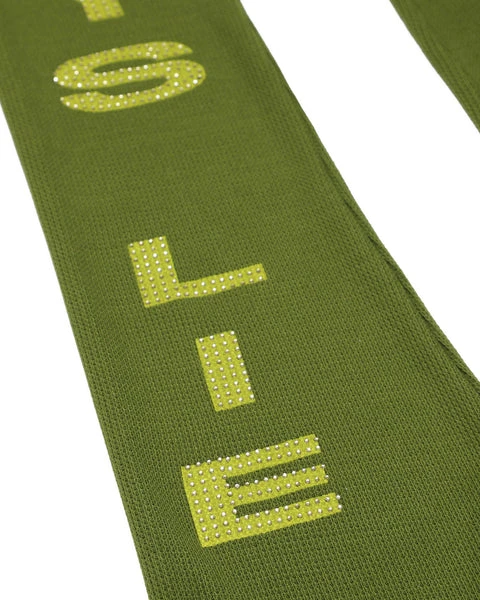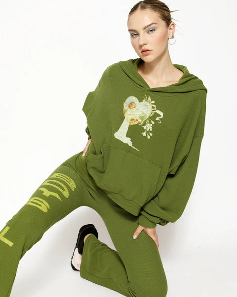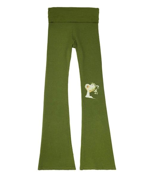 Mid rise soft thermal pants in olive green. Adjustable jersey fold-over waistband and flared hem with rhinestone embellishments.