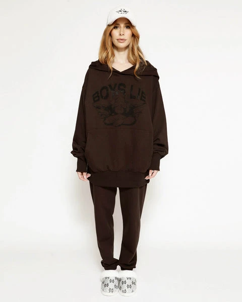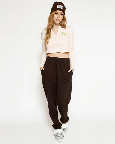 Lightweight fleece fabric in dark brown with rhinestone embellishments. High rise sweatpants with back and side pockets, elastic waistband and cuffs.