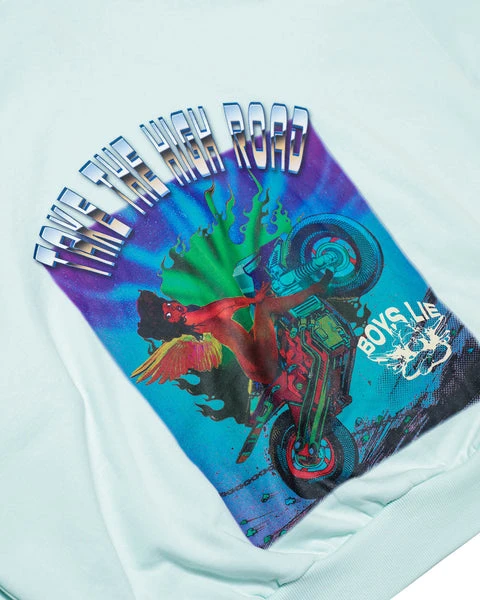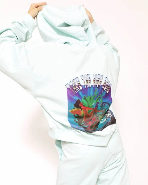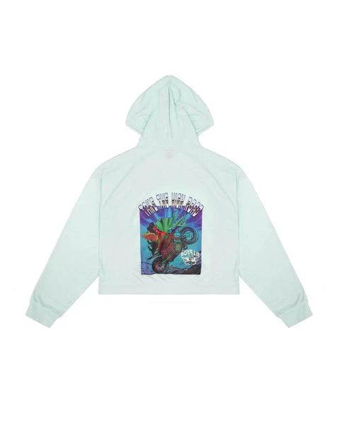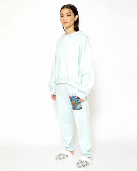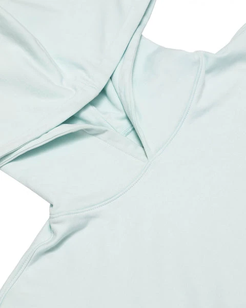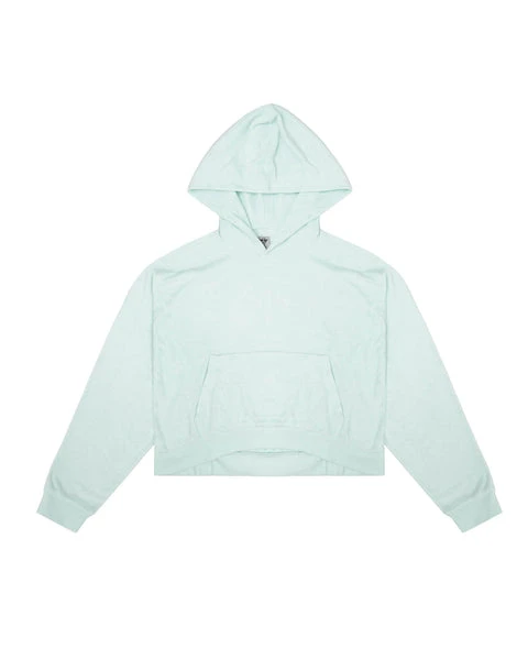 Mid-weight fleece fabric in mint green. Oversized cropped hoodie featuring a dramatic hood, front pocket, and slightly curved front hem.