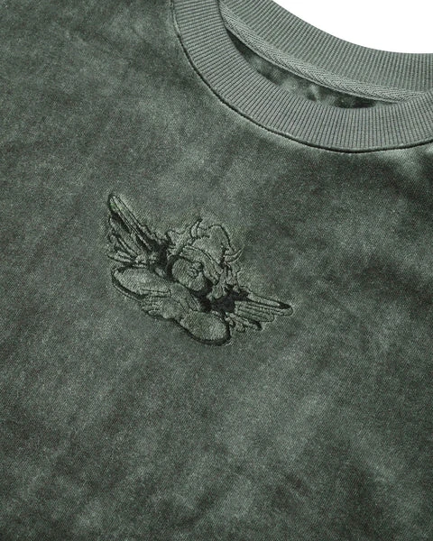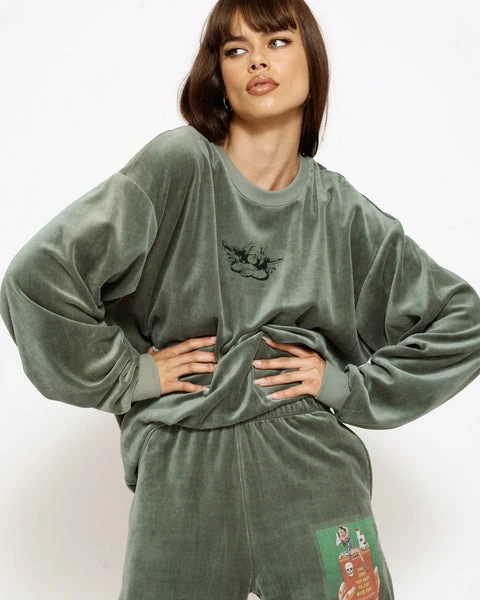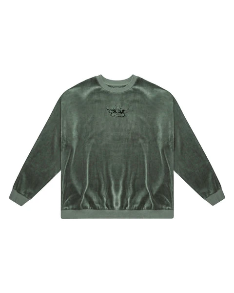 Oversized lightweight green velour crewneck sweatshirt with black embroidered logo, ribbed neckline, cuffs, and hem. This print is designed to crackle, just like your favorite vintage crewneck.