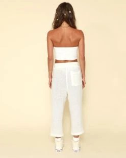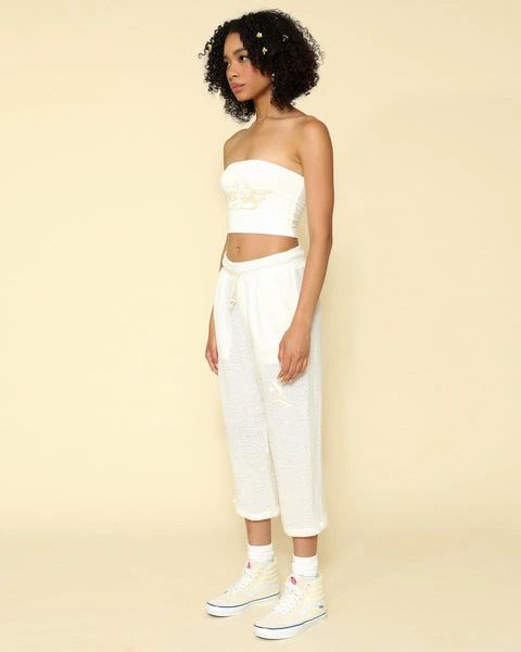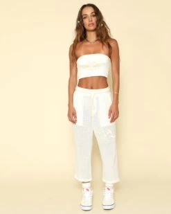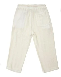 Mid-rise woven slubby cotton pant. Sheer fabric, drawstring waist, side pockets, dropped crotch, and cropped hem. Made in Los Angeles, California.