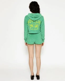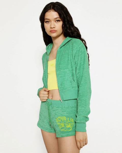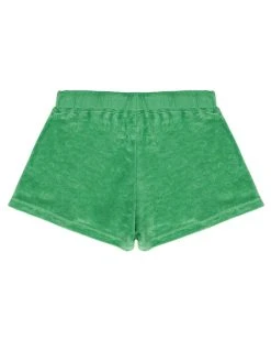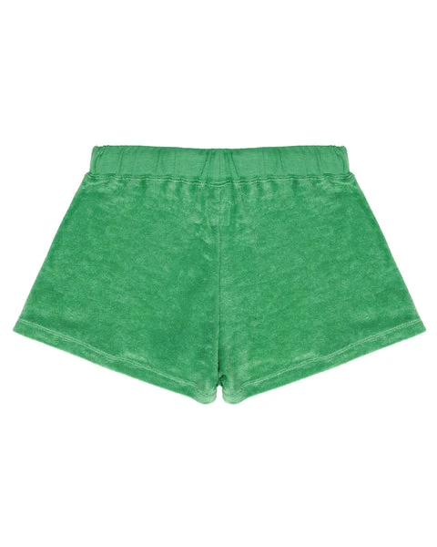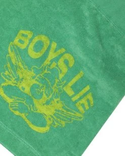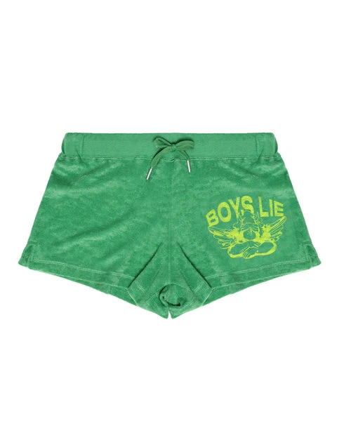 Lightweight terry cloth fabric in vibrant green. Mid-rise shorts with adjustable drawstring and yellow Boys Lie logo graphic.