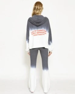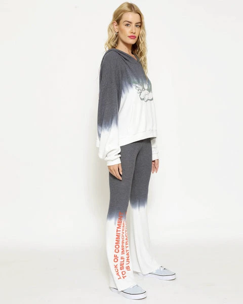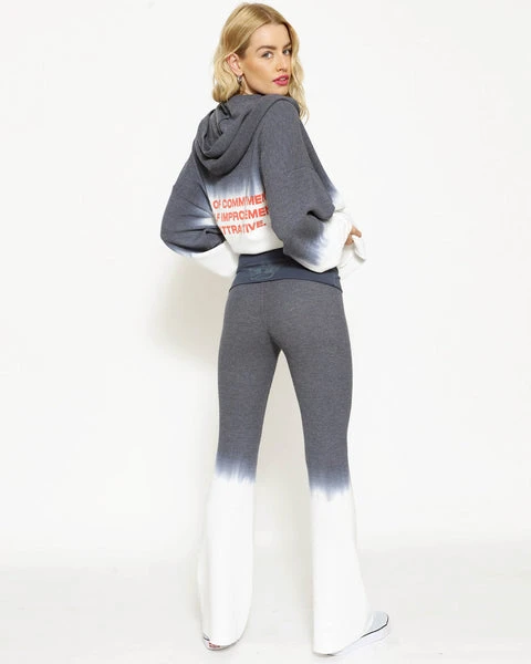 Mid rise soft thermal pants in blue and white dip dye. Adjustable jersey fold-over waistband and flared hem. These items are individually dyed and may have slight color variations.