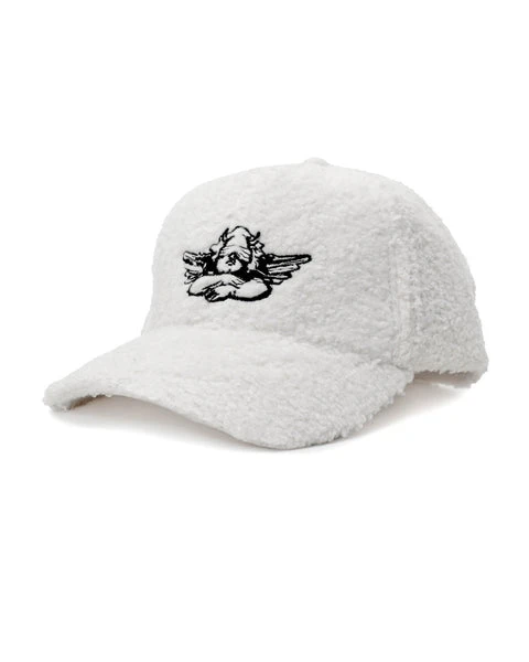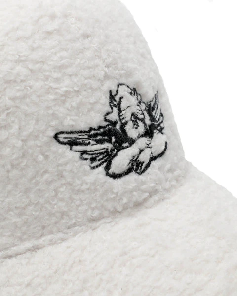 Faux cream sherpa baseball hat with black Boys Lie cherub logo and an adjustable velcro strap.