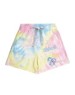 Lightweight fleece in pink, yellow, and blue tie dye. High rise sweat shorts with a thick elastic waistband, adjustable drawstring, and side pockets. Each item is hand dyed and may show slight color variations.