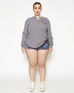 Velour fabric in purple. Mid-rise shorts with adjustable drawstring and front graphic.