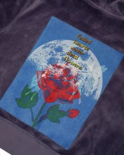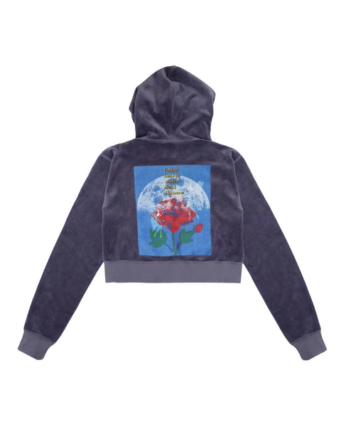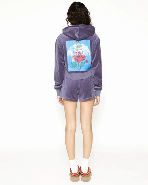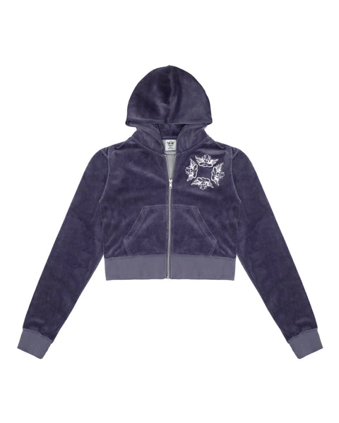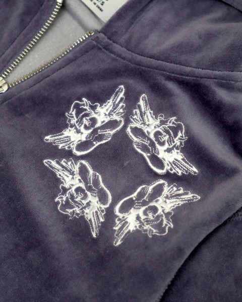 Velour fabric in purple. Zip up hoodie with cropped hem, front pockets, and embroidered front logos.