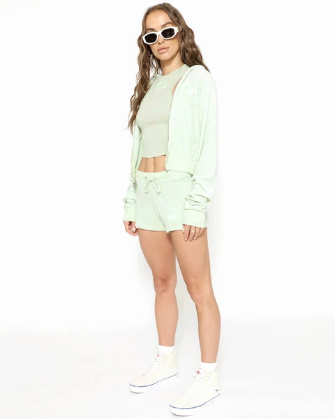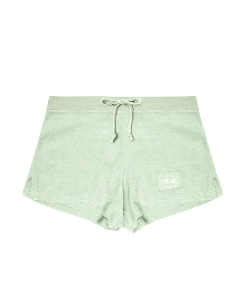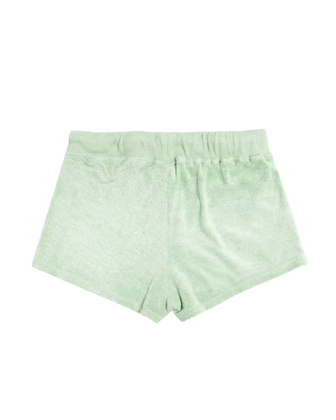Lightweight terry cloth fabric in mint green. Mid-rise shorts with adjustable drawstring and Boys Lie logo patch. Washed for a vintage look and feel.