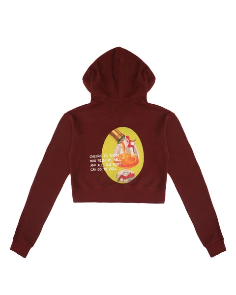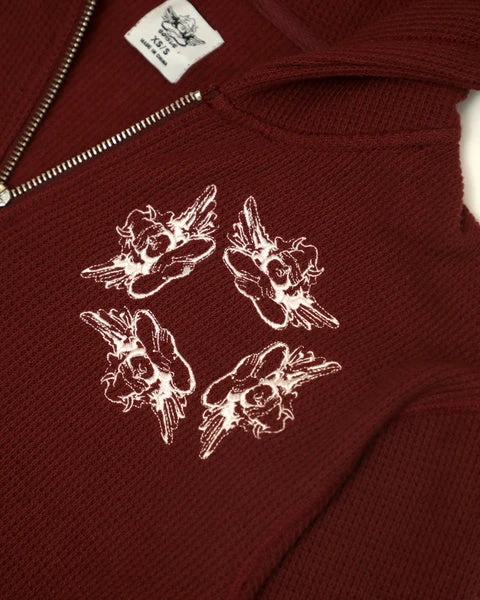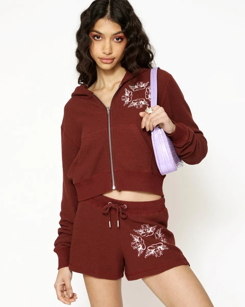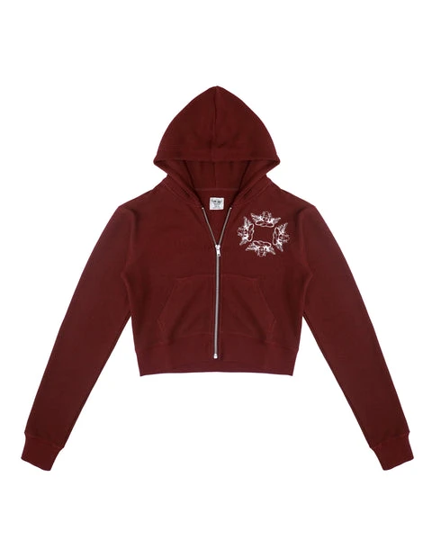 Soft thermal fabric in deep maroon. Zip up hoodie with cropped hem, front pockets, and zipper. Features embroidered details on the front and back.