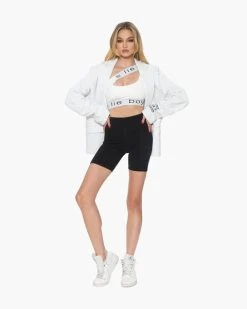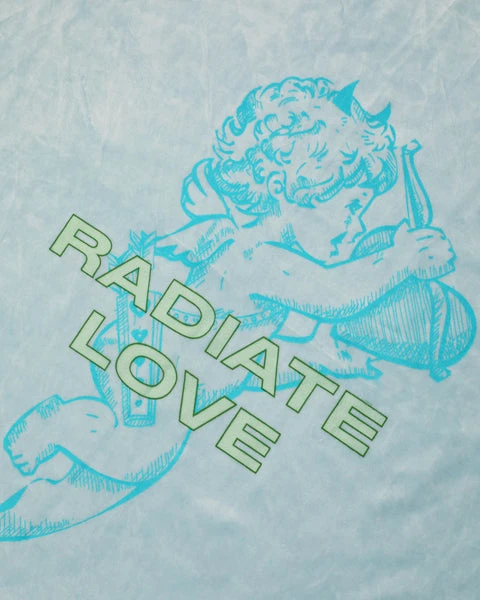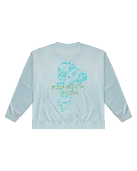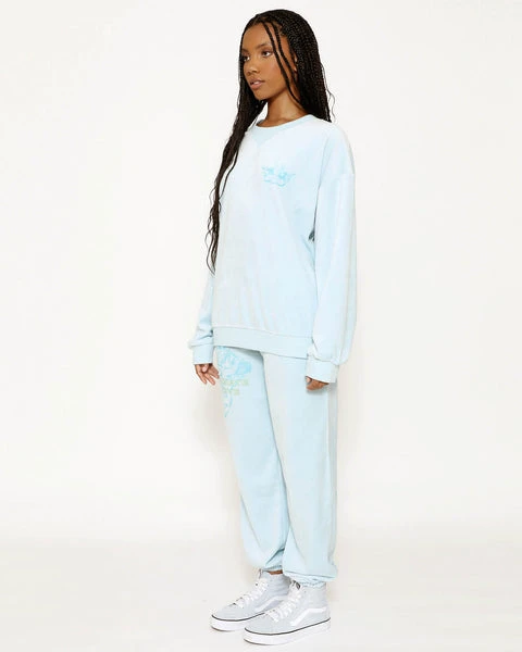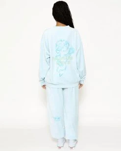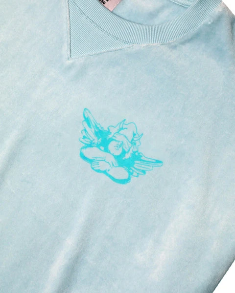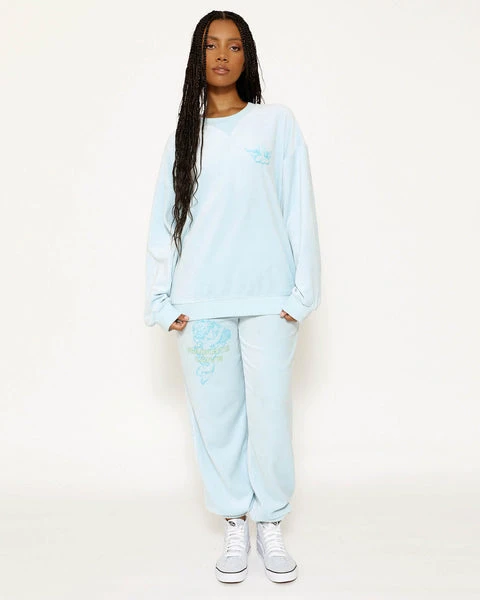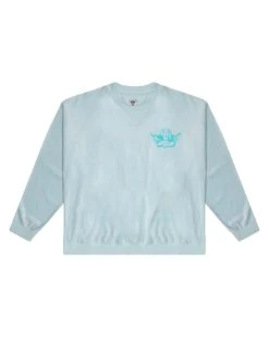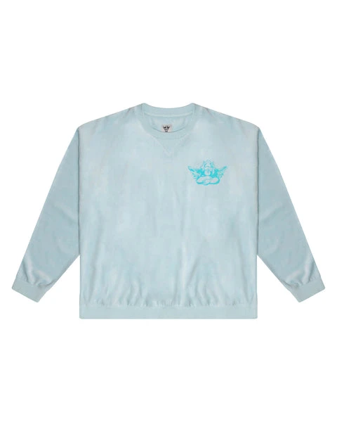 Lightweight velour fabric in light blue. Oversized crewneck sweatshirt with ribbed neckline, cuffs, and hem. This print is designed to crackle, just like your favorite vintage crewneck.