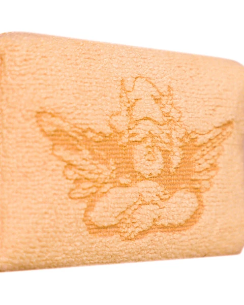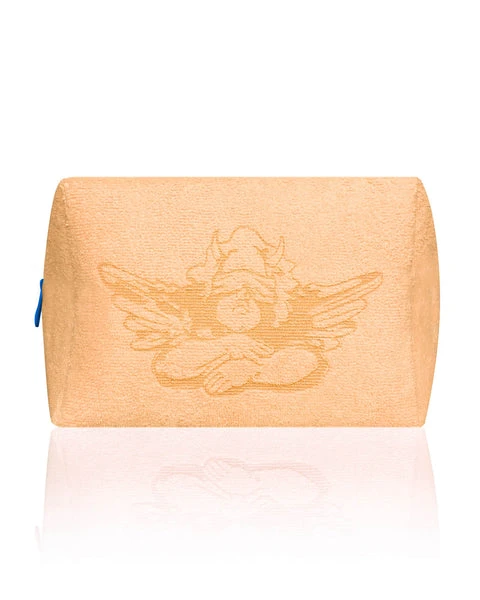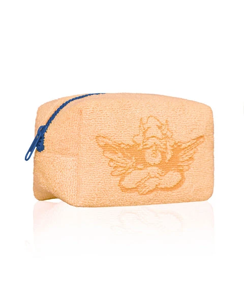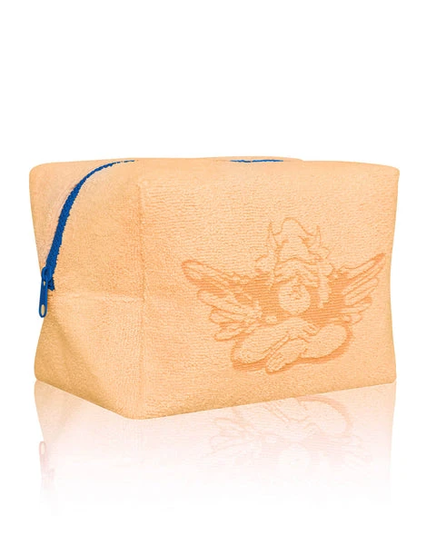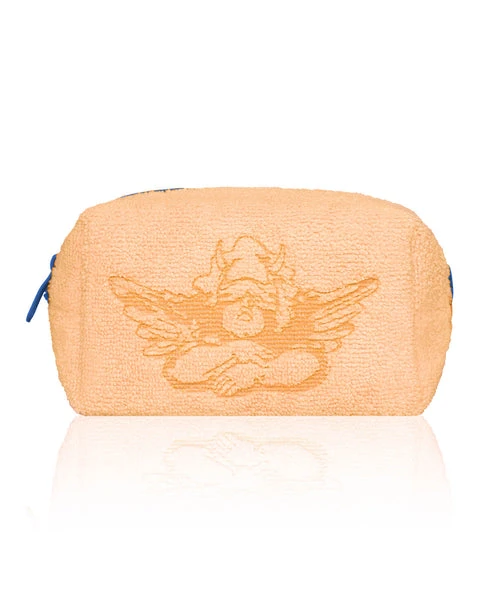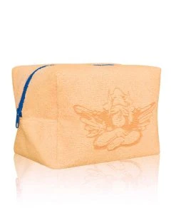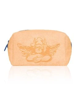 Orange terry cloth pouch with contrast blue zipper. Available in Small and Large sizes.